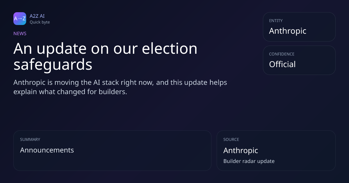 An update on our election safeguards Why it matters: Anthropic is moving the AI stack right now, and this update helps explain what changed for builders. Source: Anthropic https://a2zai.ai/bytes/an-update-on-our-election-safeguards-b1e09f38