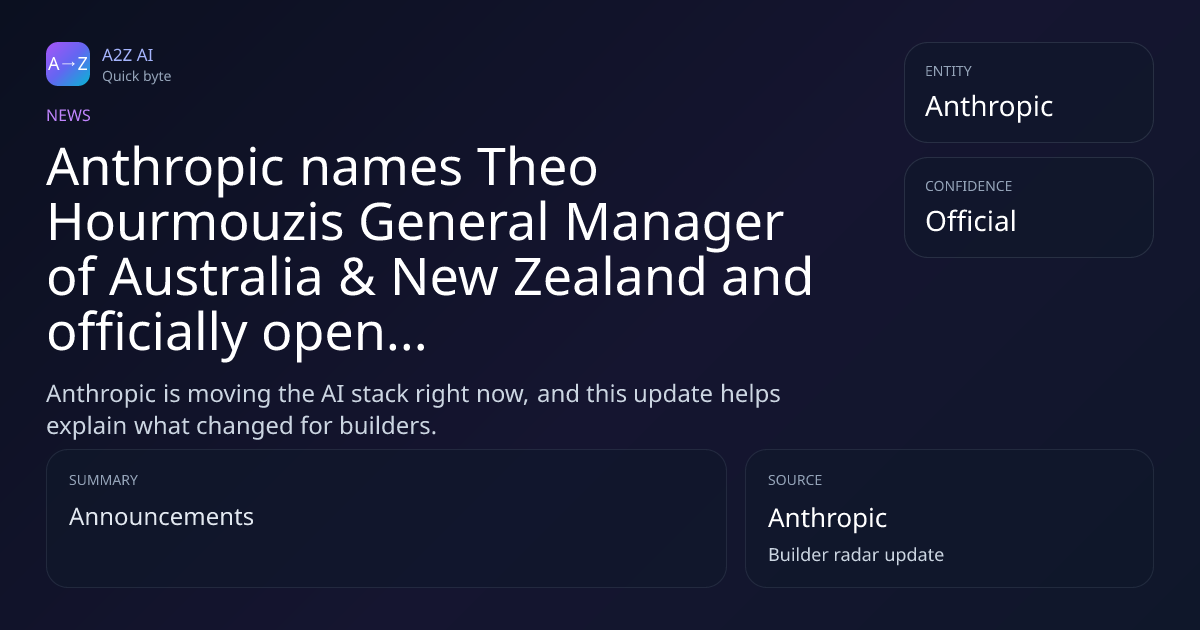 Anthropic names Theo Hourmouzis General Manager of Australia & New Zealand and officially opens Sydney office Why it matters: Anthropic is moving the AI stack right now, and this update helps explain what changed for builders. Source: Anthropic https://a2zai.ai/bytes/anthrop...