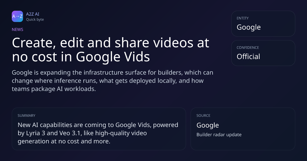 Create, edit and share videos at no cost in Google Vids Why it matters: Google is expanding the infrastructure surface for builders, which can change where inference runs, what gets deployed locally, and how teams package AI workloads. Source: Google https://a2zai.ai/bytes/c...
