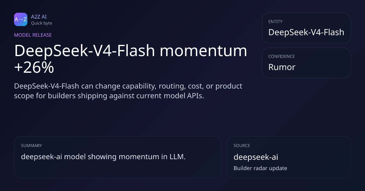 DeepSeek-V4-Flash momentum +26% Why it matters: DeepSeek-V4-Flash can change capability, routing, cost, or product scope for builders shipping against current model APIs. Rumor watch: deepseek-ai https://a2zai.ai/bytes/deepseek-v4-flash-momentum-26-0d2e6491