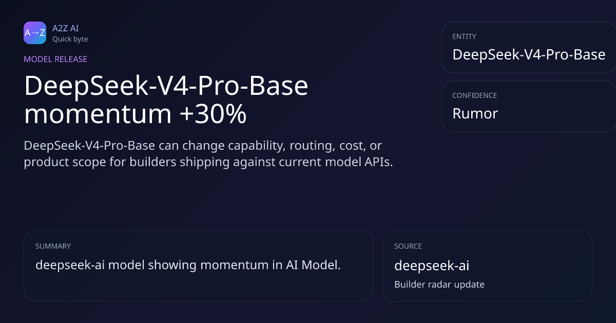 DeepSeek-V4-Pro-Base momentum +30% Why it matters: DeepSeek-V4-Pro-Base can change capability, routing, cost, or product scope for builders shipping against current model APIs. Rumor watch: deepseek-ai https://a2zai.ai/bytes/deepseek-v4-pro-base-momentum-30-48b9adb1