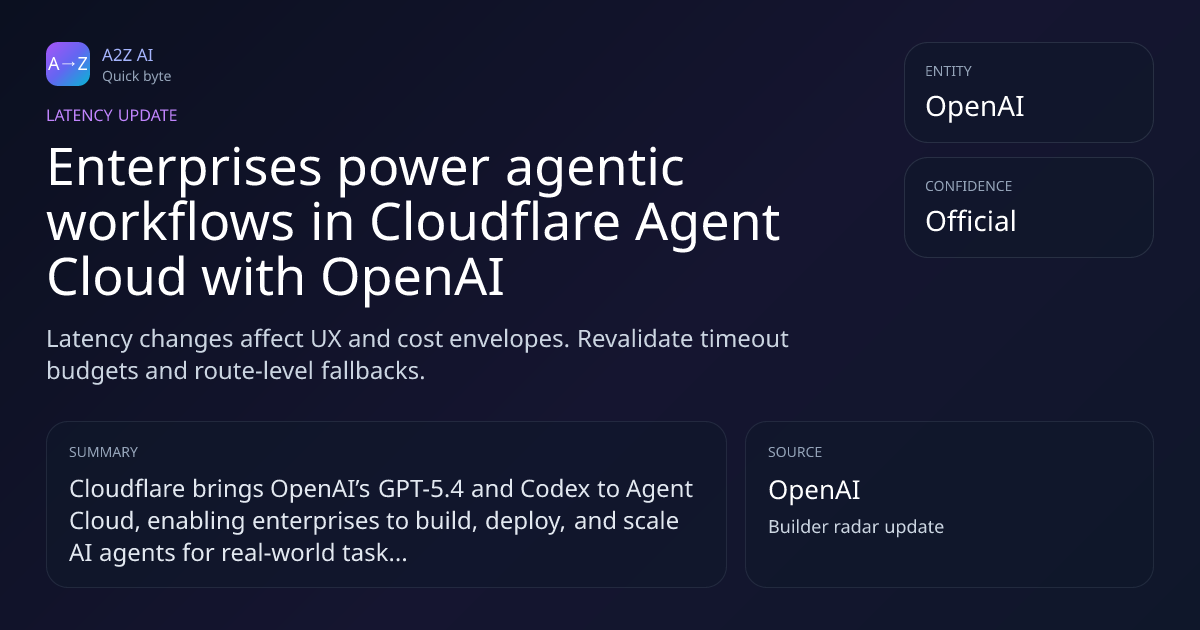 Enterprises power agentic workflows in Cloudflare Agent Cloud with OpenAI Why it matters: Latency changes affect UX and cost envelopes. Revalidate timeout budgets and route-level fallbacks. Source: OpenAI https://a2zai.ai/bytes/enterprises-power-agentic-workflows-in-cloudfla...