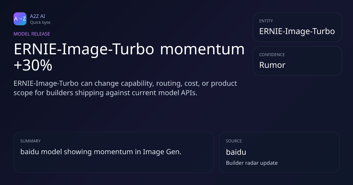ERNIE-Image-Turbo momentum +30% Why it matters: ERNIE-Image-Turbo can change capability, routing, cost, or product scope for builders shipping against current model APIs. Rumor watch: baidu https://a2zai.ai/bytes/ernie-image-turbo-momentum-30-c145a21c