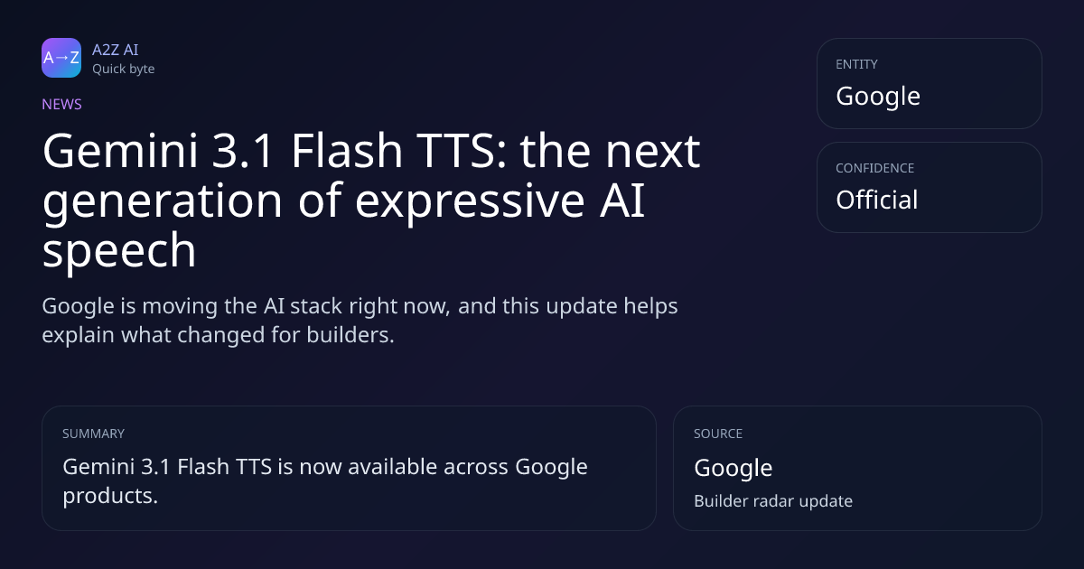 Gemini 3.1 Flash TTS: the next generation of expressive AI speech Why it matters: Google is moving the AI stack right now, and this update helps explain what changed for builders. Source: Google https://a2zai.ai/bytes/gemini-3-1-flash-tts-the-next-generation-of-expressive-ai...