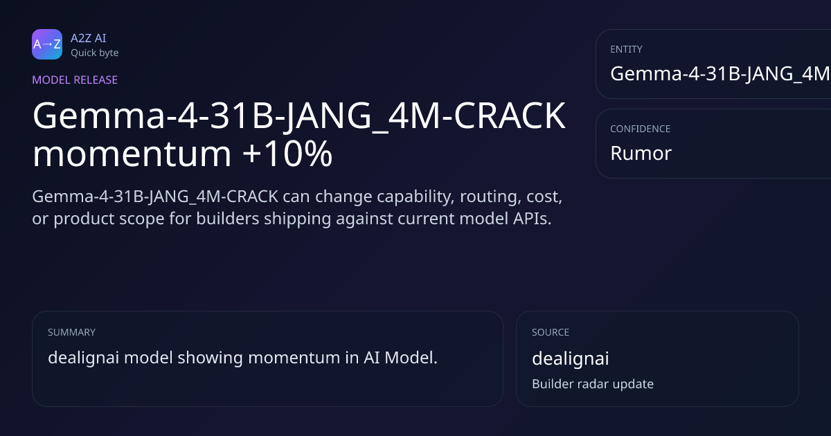Gemma-4-31B-JANG_4M-CRACK momentum +10% Why it matters: Gemma-4-31B-JANG_4M-CRACK can change capability, routing, cost, or product scope for builders shipping against current model APIs. Rumor watch: dealignai https://a2zai.ai/bytes/gemma-4-31b-jang-4m-crack-momentum-10-cf09...