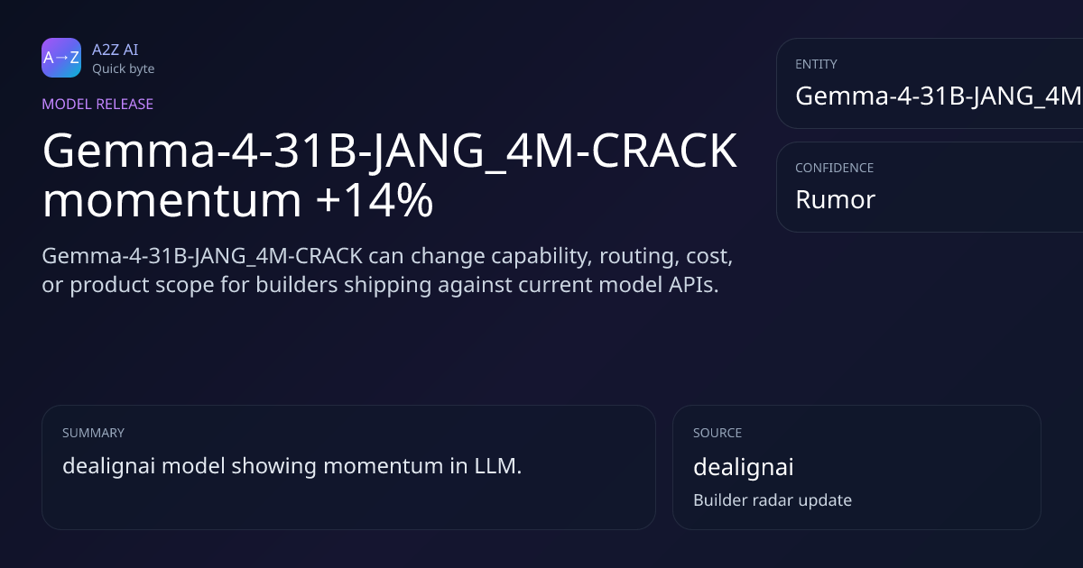 Gemma-4-31B-JANG_4M-CRACK momentum +14% Why it matters: Gemma-4-31B-JANG_4M-CRACK can change capability, routing, cost, or product scope for builders shipping against current model APIs. Rumor watch: dealignai https://a2zai.ai/bytes/gemma-4-31b-jang-4m-crack-momentum-14-cf09...
