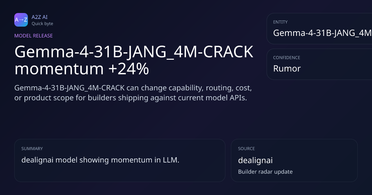 Gemma-4-31B-JANG_4M-CRACK momentum +24% Why it matters: Gemma-4-31B-JANG_4M-CRACK can change capability, routing, cost, or product scope for builders shipping against current model APIs. Rumor watch: dealignai https://a2zai.ai/bytes/gemma-4-31b-jang-4m-crack-momentum-24-cf09...