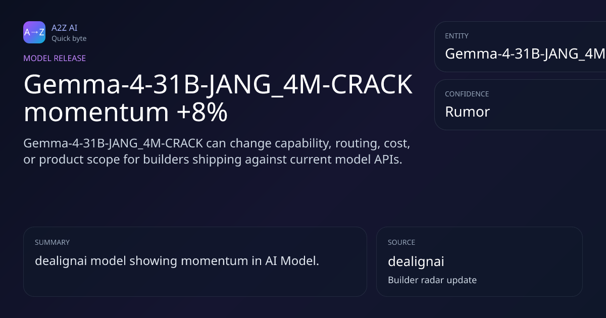 Gemma-4-31B-JANG_4M-CRACK momentum +8% Why it matters: Gemma-4-31B-JANG_4M-CRACK can change capability, routing, cost, or product scope for builders shipping against current model APIs. Rumor watch: dealignai https://a2zai.ai/bytes/gemma-4-31b-jang-4m-crack-momentum-8-cf094c4c