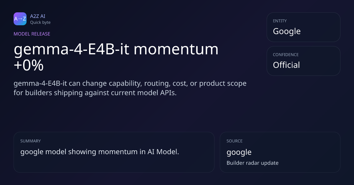 gemma-4-E4B-it momentum +0% Why it matters: gemma-4-E4B-it can change capability, routing, cost, or product scope for builders shipping against current model APIs. Source: google https://a2zai.ai/bytes/gemma-4-e4b-it-momentum-0-f9cf2d06