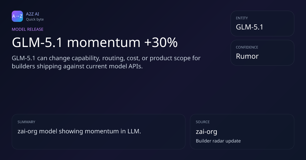 GLM-5.1 momentum +30% Why it matters: GLM-5.1 can change capability, routing, cost, or product scope for builders shipping against current model APIs. Rumor watch: zai-org https://a2zai.ai/bytes/glm-5-1-momentum-30-d71cf050