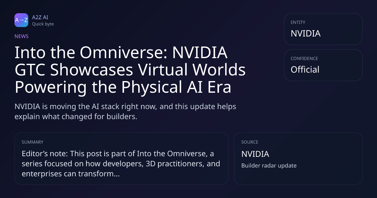 Into the Omniverse: NVIDIA GTC Showcases Virtual Worlds Powering the Physical AI Era Why it matters: NVIDIA is moving the AI stack right now, and this update helps explain what changed for builders. Source: NVIDIA https://a2zai.ai/bytes/into-the-omniverse-nvidia-gtc-showcase...