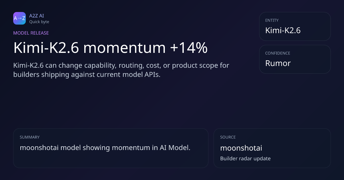 Kimi-K2.6 momentum +14% Why it matters: Kimi-K2.6 can change capability, routing, cost, or product scope for builders shipping against current model APIs. Rumor watch: moonshotai https://a2zai.ai/bytes/kimi-k2-6-momentum-14-0354c1b1
