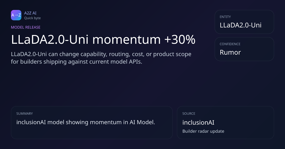 LLaDA2.0-Uni momentum +30% Why it matters: LLaDA2.0-Uni can change capability, routing, cost, or product scope for builders shipping against current model APIs. Rumor watch: inclusionAI https://a2zai.ai/bytes/llada2-0-uni-momentum-30-07a3da1b