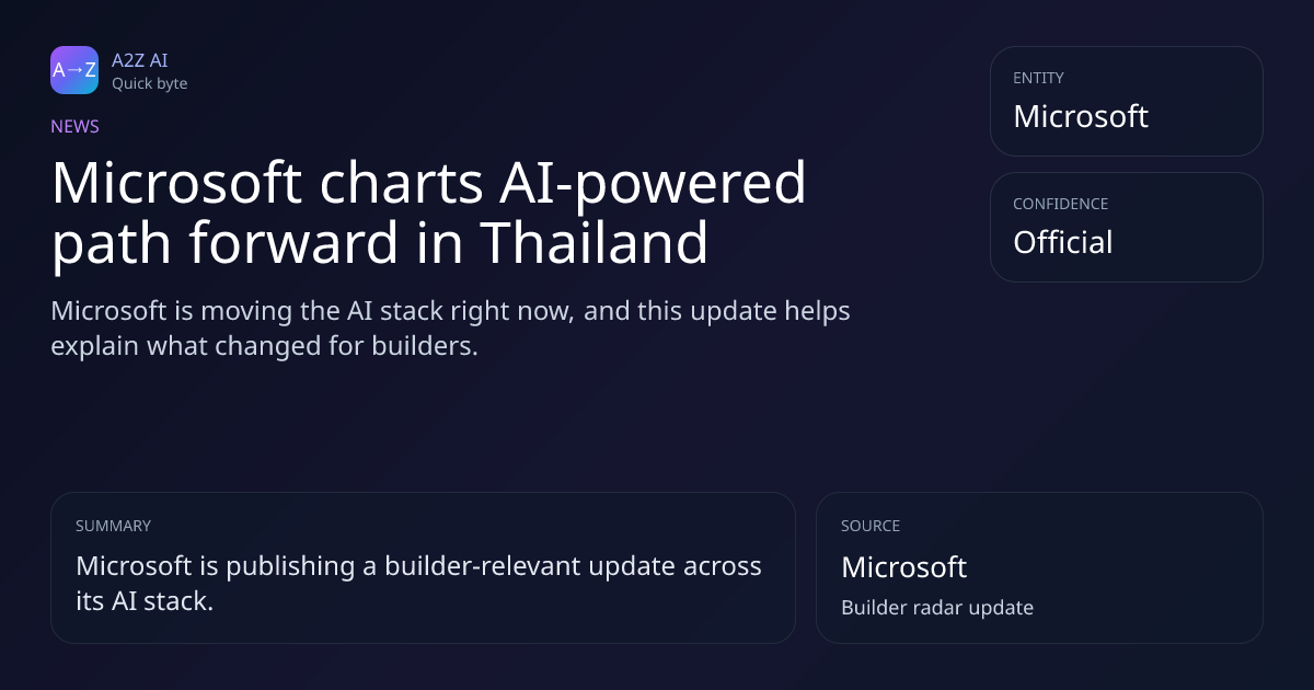Microsoft charts AI‑powered path forward in Thailand Why it matters: Microsoft is moving the AI stack right now, and this update helps explain what changed for builders. Source: Microsoft https://a2zai.ai/bytes/microsoft-charts-ai-powered-path-forward-in-thailand-7c49dfd6