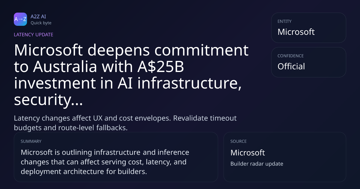Microsoft deepens commitment to Australia with A$25B investment in AI infrastructure, security and skills Why it matters: Latency changes affect UX and cost envelopes. Revalidate timeout budgets and route-level fallbacks. Source: Microsoft https://a2zai.ai/bytes/microsoft-de...