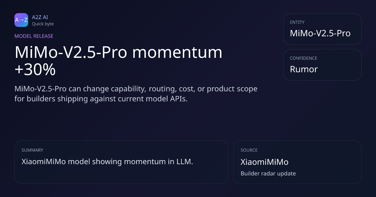 MiMo-V2.5-Pro momentum +30% Why it matters: MiMo-V2.5-Pro can change capability, routing, cost, or product scope for builders shipping against current model APIs. Rumor watch: XiaomiMiMo https://a2zai.ai/bytes/mimo-v2-5-pro-momentum-30-83ed1672