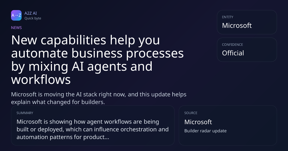 New capabilities help you automate business processes by mixing AI agents and workflows Why it matters: Microsoft is moving the AI stack right now, and this update helps explain what changed for builders. Source: Microsoft https://a2zai.ai/bytes/new-capabilities-help-you-aut...