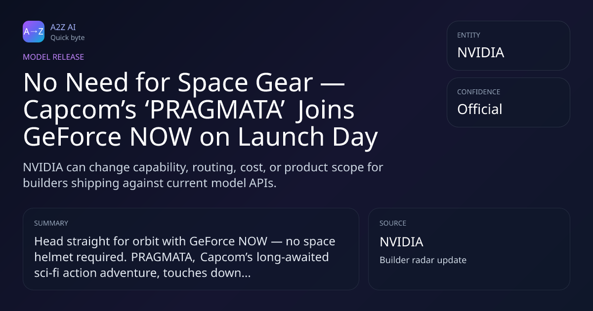 No Need for Space Gear — Capcom’s ‘PRAGMATA’ Joins GeForce NOW on Launch Day Why it matters: NVIDIA can change capability, routing, cost, or product scope for builders shipping against current model APIs. Source: NVIDIA https://a2zai.ai/bytes/no-need-for-space-gear-capcom-s-...