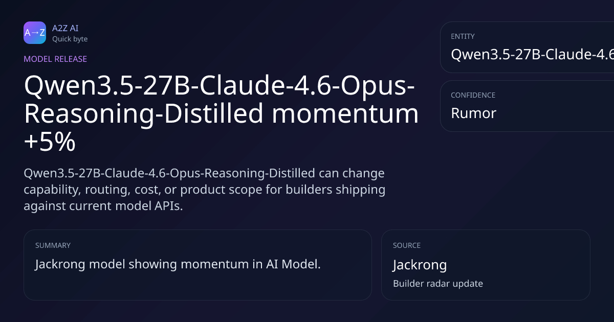 Qwen3.5-27B-Claude-4.6-Opus-Reasoning-Distilled momentum +5% Why it matters: Qwen3.5-27B-Claude-4.6-Opus-Reasoning-Distilled can change capability, routing, cost, or product scope for builders shipping against current model APIs. Rumor watch: Jackrong https://a2zai.ai/bytes/...