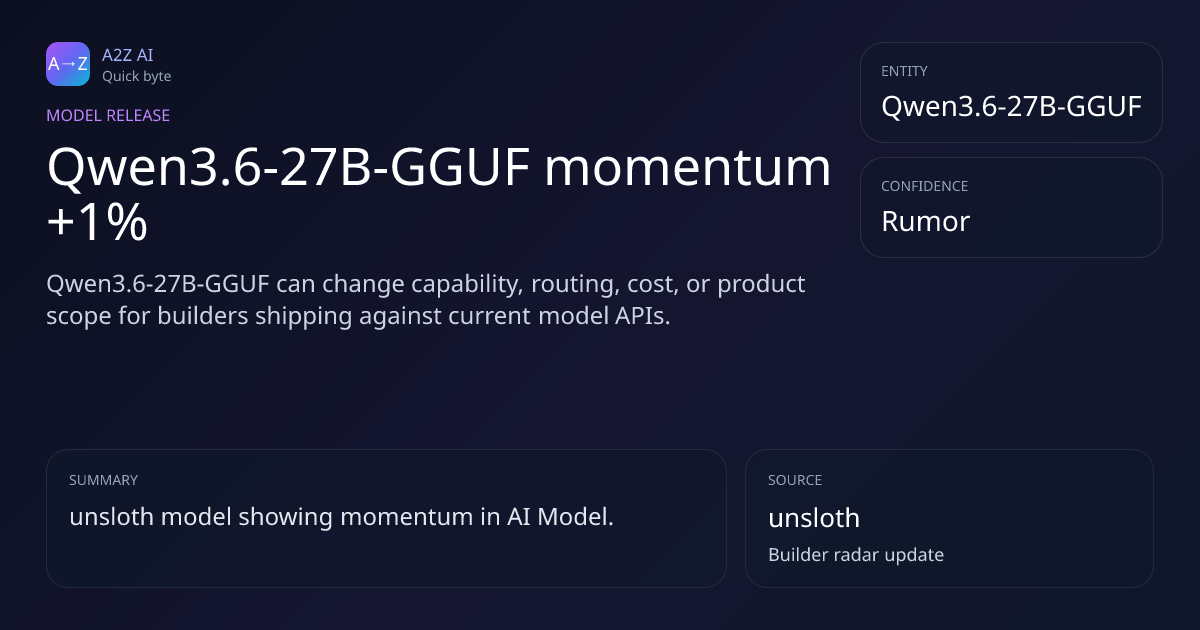 Qwen3.6-27B-GGUF momentum +1% Why it matters: Qwen3.6-27B-GGUF can change capability, routing, cost, or product scope for builders shipping against current model APIs. Rumor watch: unsloth https://a2zai.ai/bytes/qwen3-6-27b-gguf-momentum-1-9dcdef09