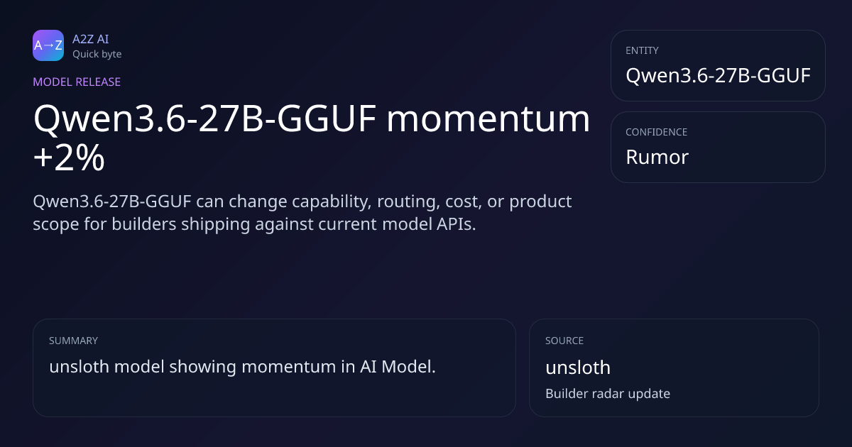 Qwen3.6-27B-GGUF momentum +2% Why it matters: Qwen3.6-27B-GGUF can change capability, routing, cost, or product scope for builders shipping against current model APIs. Rumor watch: unsloth https://a2zai.ai/bytes/qwen3-6-27b-gguf-momentum-2-9dcdef09