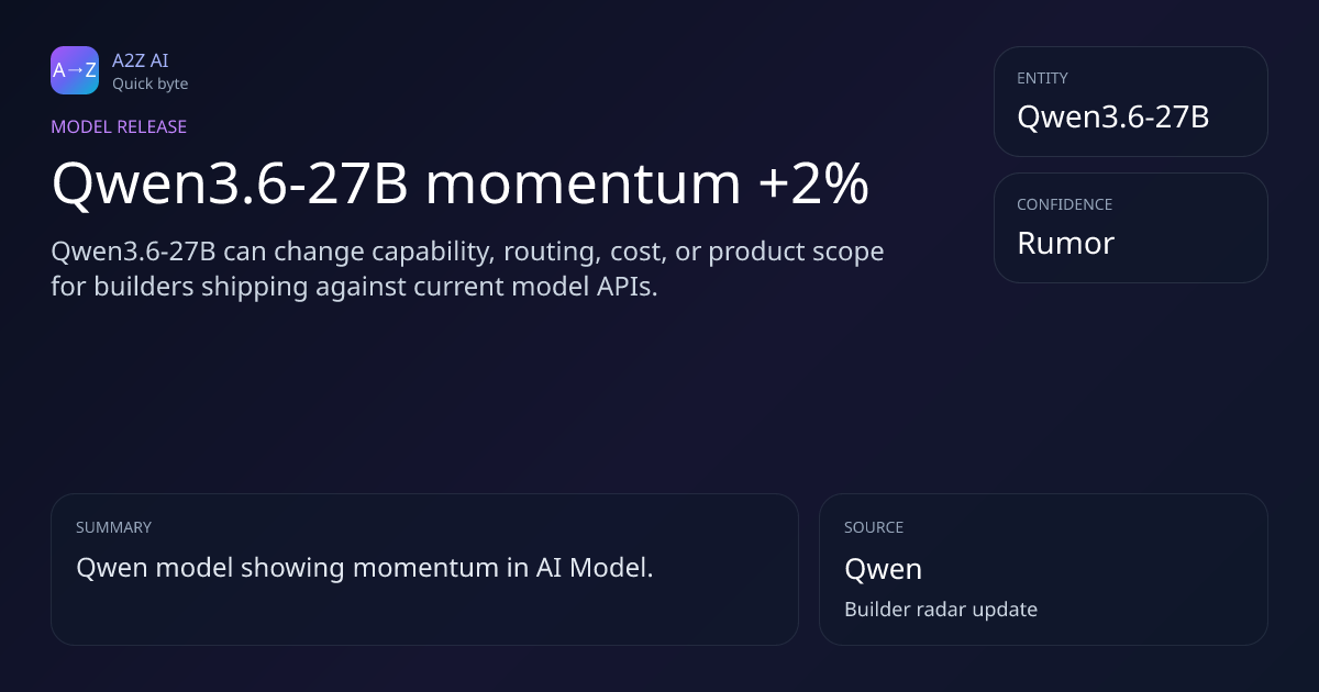 Qwen3.6-27B momentum +2% Why it matters: Qwen3.6-27B can change capability, routing, cost, or product scope for builders shipping against current model APIs. Rumor watch: Qwen https://a2zai.ai/bytes/qwen3-6-27b-momentum-2-ff675bbc