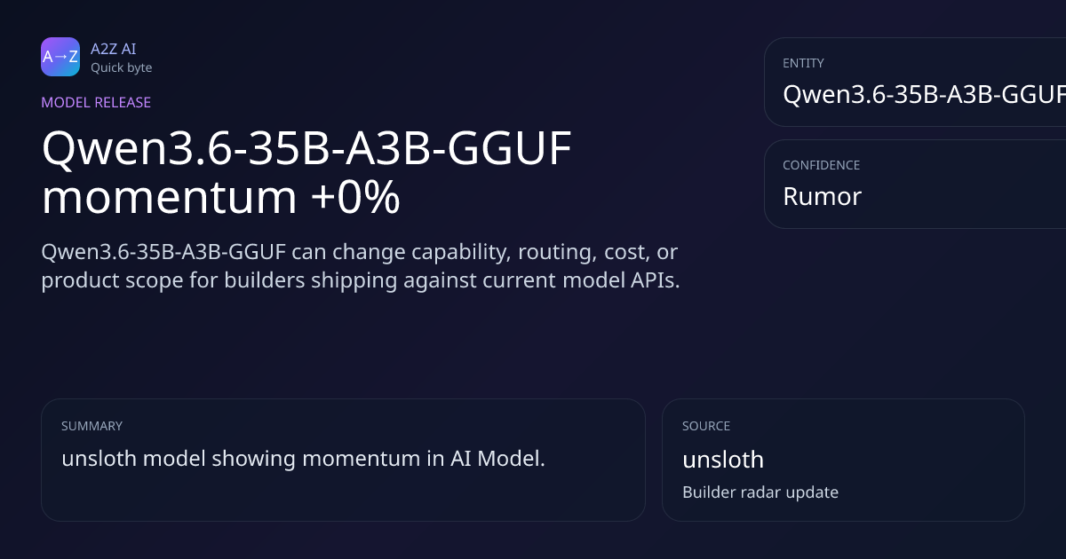 Qwen3.6-35B-A3B-GGUF momentum +0% Why it matters: Qwen3.6-35B-A3B-GGUF can change capability, routing, cost, or product scope for builders shipping against current model APIs. Rumor watch: unsloth https://a2zai.ai/bytes/qwen3-6-35b-a3b-gguf-momentum-0-d0931ad0