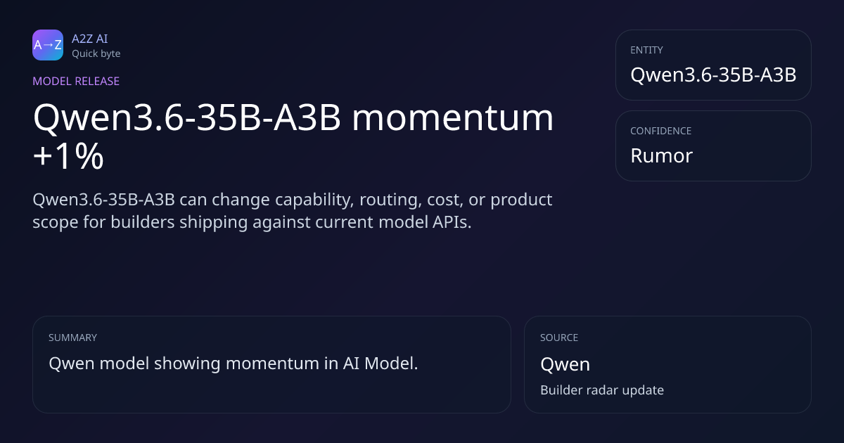 Qwen3.6-35B-A3B momentum +1% Why it matters: Qwen3.6-35B-A3B can change capability, routing, cost, or product scope for builders shipping against current model APIs. Rumor watch: Qwen https://a2zai.ai/bytes/qwen3-6-35b-a3b-momentum-1-06aa734c