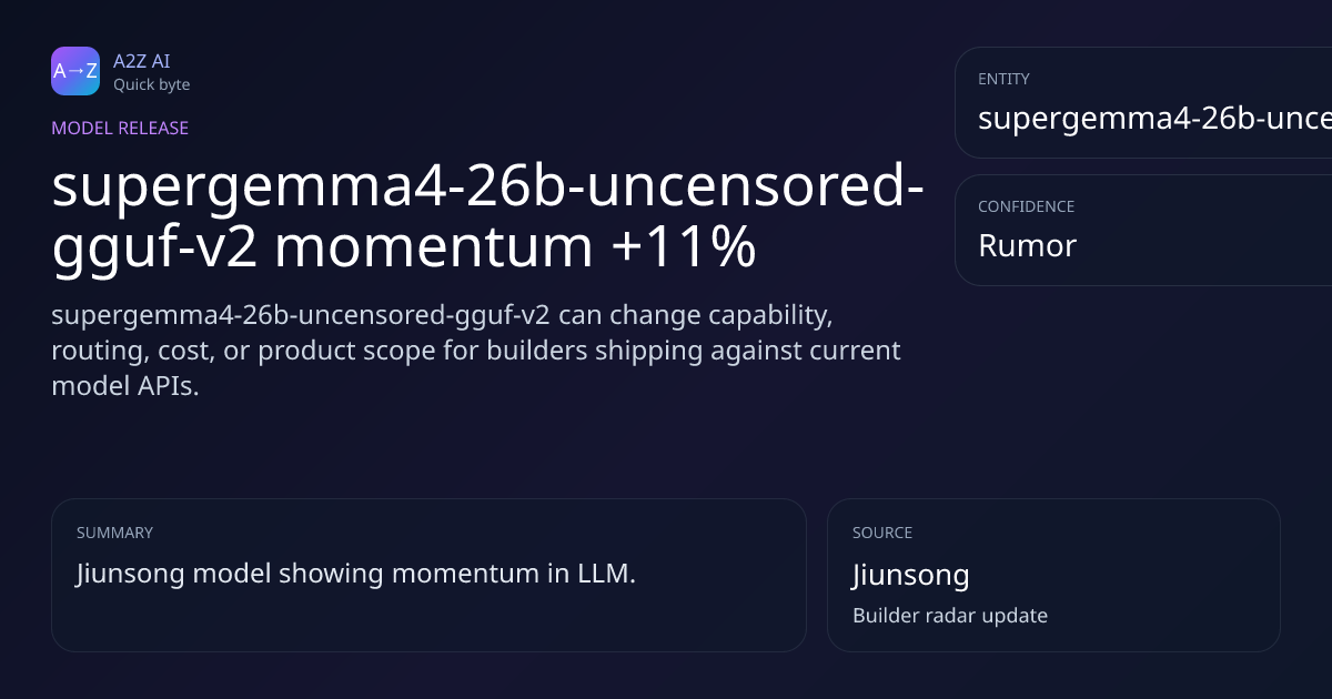 supergemma4-26b-uncensored-gguf-v2 momentum +11% Why it matters: supergemma4-26b-uncensored-gguf-v2 can change capability, routing, cost, or product scope for builders shipping against current model APIs. Rumor watch: Jiunsong https://a2zai.ai/bytes/supergemma4-26b-uncensore...