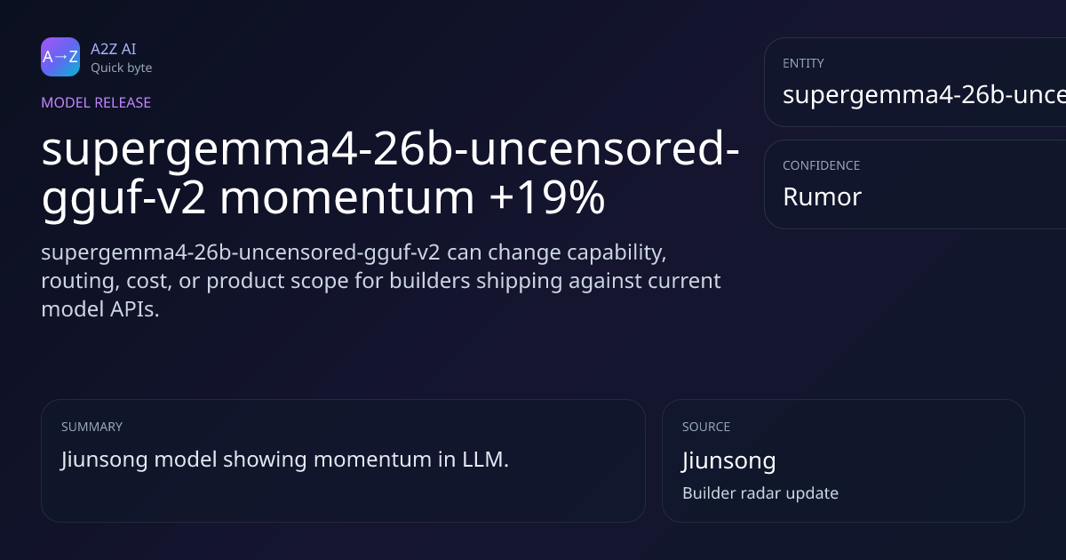 supergemma4-26b-uncensored-gguf-v2 momentum +19% Why it matters: supergemma4-26b-uncensored-gguf-v2 can change capability, routing, cost, or product scope for builders shipping against current model APIs. Rumor watch: Jiunsong https://a2zai.ai/bytes/supergemma4-26b-uncensore...