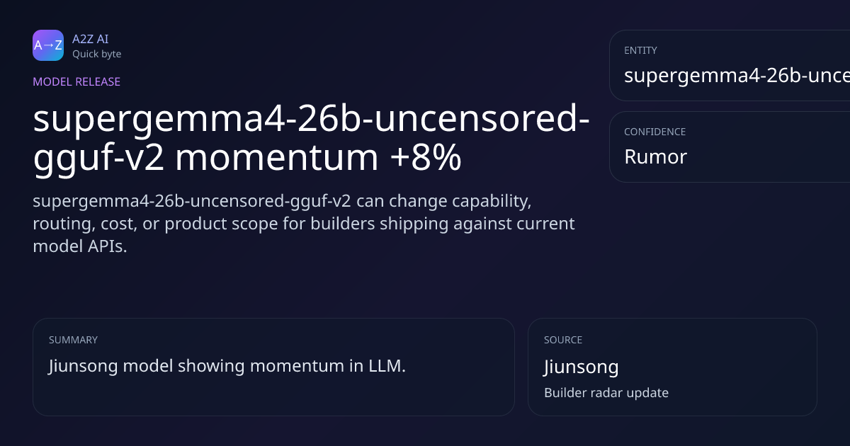 supergemma4-26b-uncensored-gguf-v2 momentum +8% Why it matters: supergemma4-26b-uncensored-gguf-v2 can change capability, routing, cost, or product scope for builders shipping against current model APIs. Rumor watch: Jiunsong https://a2zai.ai/bytes/supergemma4-26b-uncensored...