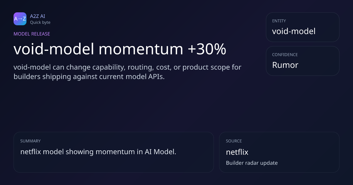void-model momentum +30% Why it matters: void-model can change capability, routing, cost, or product scope for builders shipping against current model APIs. Rumor watch: netflix https://a2zai.ai/bytes/void-model-momentum-30-20dbb7a5