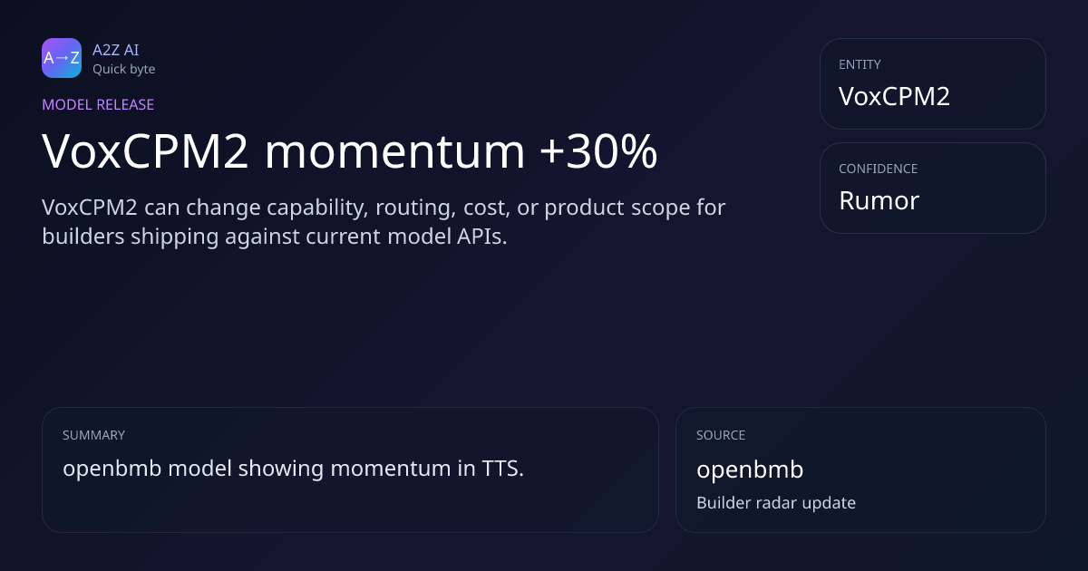 VoxCPM2 momentum +30% Why it matters: VoxCPM2 can change capability, routing, cost, or product scope for builders shipping against current model APIs. Rumor watch: openbmb https://a2zai.ai/bytes/voxcpm2-momentum-30-f04c3de5